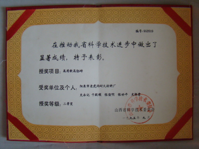 熱風爐用低蠕變高鋁磚、高荷軟高鋁磚獲省科技進步二等獎,微膨脹高鋁磚列入火炬計劃項目,炭素焙燒爐用特種高鋁磚已批準國家專利